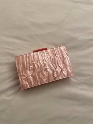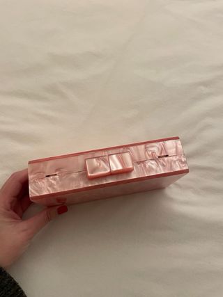 Clutch Aguamare Rosa. Va haciendo reflejitos en nácar blanco. Comprado en Junio de 2023 por 59€. Agotado en tienda. Puesta en una única ocasión en un bautizo. Instagram de la marca: @acus_complementos