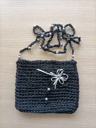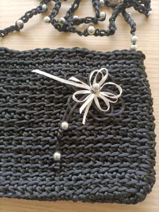 Bolso negro tejido a mano, con un diseño único y elegante. Perfecto para complementar tu estilo. - Asa con detalles abalorios plateados, largo 50 cm aproximadamente para llevar al hombro o modo bandolera. - Adorno de lazo blanco con cuentas plateadas. - Cierre mediante imán magnético plateado. Medidas en las fotografías.