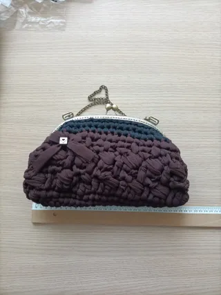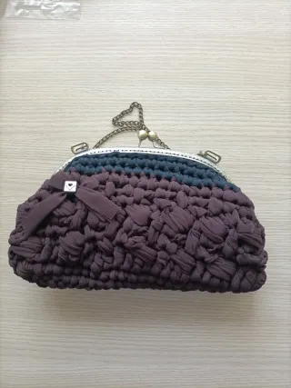 Bolso de fiesta tejido a mano con un diseño único. - Cierre de boquilla metálico. - Cadena metálica para llevar al hombro. - Adorno de lazo. - Pequeño detalle en forma de corazón.