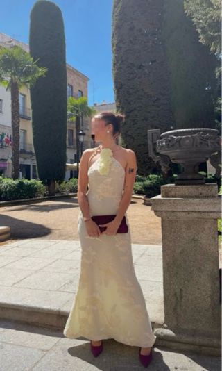 Vestido largo de la marca Bella Barnett El vestido se llama Griselda Flower Halter Stickerei Maxi Kleid fue comprado el año pasado para una graduación, tengo la confirmación de la factura. El precio exacto 110 € Es bastante elástico y un poco transparente al ser de gasa, pero muy cómodo. - Diseño con escote halter. - Adorno floral en el escote. - Corte sirena. - Incluye un clutch a juego.