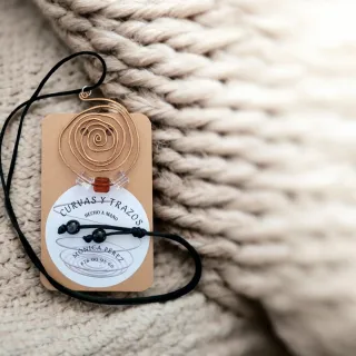 Colgante con diseño abstracto en espiral. Elaborado con alambre de aluminio en tono cobre. Cuentas de cristal transparentes y una central de color ámbar. Cordón negro ajustable con cuentas negras.