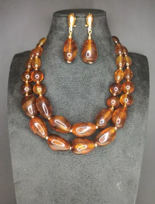 Elegante conjunto de collar y pendientes. - Collar de dos hileras con cuentas de Ambar resin - Pendientes colgantes a juego con cierre de clip.