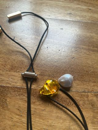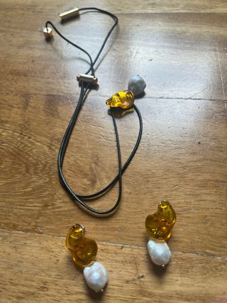 Elegante conjunto de collar y pendientes con detalles en ámbar y perlas de la firma Adolfo Dominguez 100% original Nuevo sin etiquetas Envío rápido 📦 - Collar con cordón negro ajustable. - Colgante del collar con cuentas de ámbar y perla. - Pendientes a juego con cuentas de ámbar y perla.