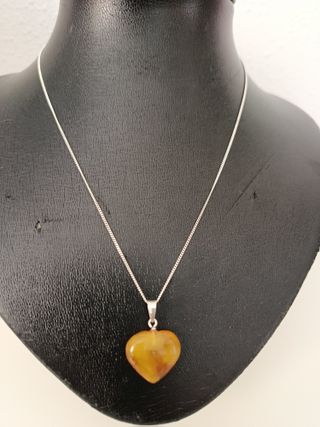 Elegante conjunto de joyería con piedras de ámbar. Largo cadena 40.cm.l.colgante 2.40 cm.l.pendientes 2 cm. - Colgante con forma de corazón. - Pendientes a juego con forma de lágrima. - Cadena de plata. - Cierre de mosquetón.