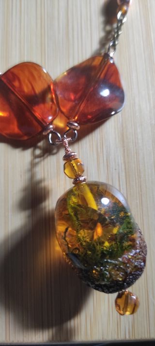 Elegante collar artesanal con un diseño cálido y sofisticado. - Cadena metálica en tono bronce envejecido. - Cuentas de resina en colores ámbar, marrón, caramelo y gris translúcido. - Cuentas redondas más pequeñas de ágatas naturales con efecto marmoleado en tonos grises y rojizos. - Colgante principal con una cuenta grande ovalada en tonos ámbar oscuro y verde oliva. - Pequeña cuenta ámbar en la parte inferior del colgante. - Precio: 16 euros.