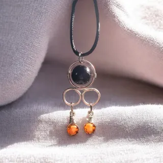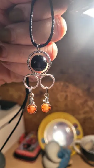 Colgante de aluminio con piedra central redonda de color negro y cuentas esféricas de color ámbar colgantes.