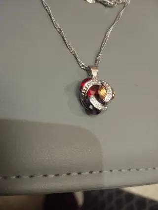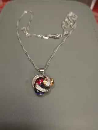 Elegante collar con un colgante adornado con piedras de diversos colores y detalles plateados. La cadena es fina y brillante, perfecta para complementar cualquier atuendo. - Diseño de nudo entrelazado en el colgante. - Incorpora gemas en tonos rojo, morado y ámbar. - Cadena de plata con cierre de mosquetón.