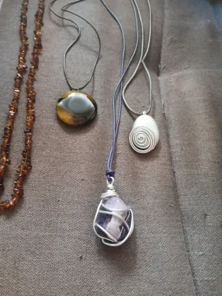 Conjunto de collares y colgantes de diferentes estilos. - Collar de perlas. - Collar con cadena dorada. - Pulsera trenzada gris. - Collar con colgante de piedra verde. - Collar de cuentas ámbar. - Collar con colgante redondo. - Collar con colgante espiral. - Collar con colgante de amatista. Se venden juntos (40 € lote) o por separado (5 € cada uno)