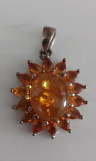 Bonito colgante con un diseño floral y una piedra central de ámbar y 14 Mandarin citrin - Elaborado en plata. - Detalle de pequeñas piedras alrededor del ámbar central.