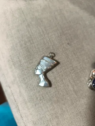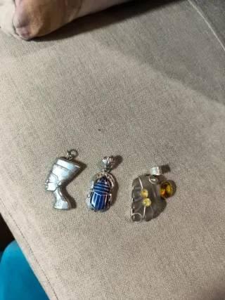 Precioso conjunto de tres colgantes con diseños inspirados en el antiguo Egipto. - Colgante de Nefertiti en plata. - Colgante de escarabajo con detalles en azul. - Colgante con piedras amarillas y ámbar. Se venden en conjunto, precio no negociable.