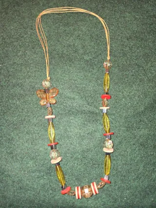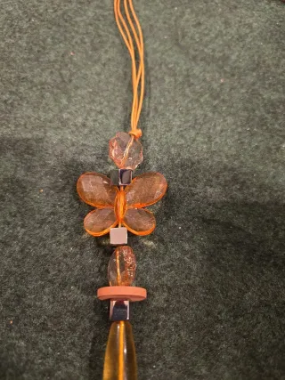 Collar artesanal con un diseño moderno y llamativo, adornado con una mariposa. - Cuentas de cristal en tonos ámbar y detalles en rojo. - Colgante con forma de mariposa. - Cordón ajustable.