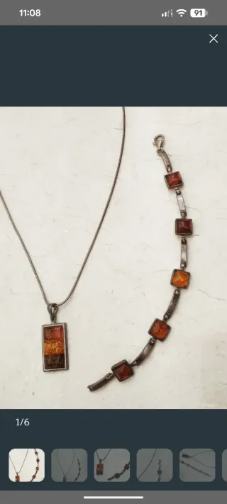 Conjunto de collar (colgante + cadena) y pulsera a juego realizado en plata y adornado con piezas de ámbar en tres tonos naturales (miel, coñac y oscuro). Estado: Muy bueno, con pátina natural de la plata que le aporta un carácter vintage único. Cierres de seguridad tipo mosquetón funcionando perfectamente. Diseño: Estilo minimalista y geométrico. El colgante es rectangular y la pulsera cuenta con 5 eslabones cuadrados de ámbar. Beautiful vintage jewelry set. Silver and amber in three colors. Elegant, timeless, and perfect for a gift or collectors. #SilverJewelry #Amber #AmberSet #VintageJewelry #Plata #Ambar #JoyeriaVintage #Boho