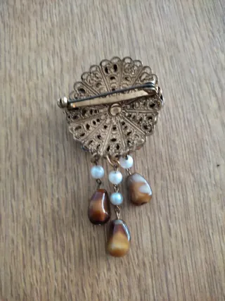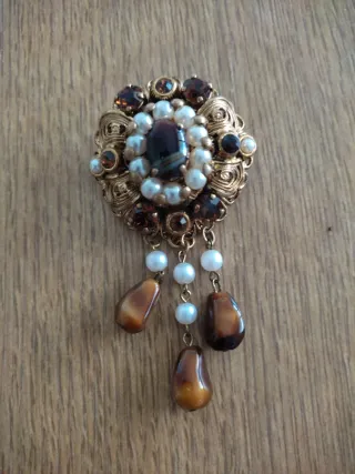 Elegante broche antiguo con un diseño intrincado y detalles llamativos. - ágatas de plástico imitación piedras marrones y ambar - Adornado con perlas - Base metálica con acabado dorado. - Colgantes con cuentas y en forma de lágrima.