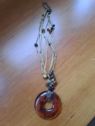 Colgante con diseño circular y detalles de cuentas. - Colgante de imitación ámbar. - Diseño con múltiples hilos. - Cuentas decorativas.
