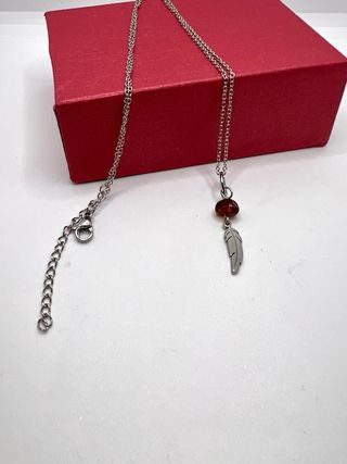 Elegantes colgantes con cadena , todo acero inoxidable y un diseño de pluma con minerales : - Material: Acero inoxidable. - Detalle: Colgante con forma de pluma. - Piedra: Ámbar de color marrón. 1-Ámbar natural 2-ámbar natural 3- Shungita 4-Perla 5- Ónix Precio por unidad .