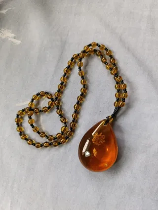 Collar artesanal con colgante en forma de gota de resina transparente color ámbar. En su interior conserva una flor seca, una concha marina y detalles naturales, creando una pieza única inspirada en la naturaleza. Incluye cordón de cuentas a juego en tonos ámbar y negro. Estado: Nuevo a estrenar. Uso: Complemento versátil para estilos boho, casual o como amuleto natural. Incluye: Colgante, collar de cuentas y caja de presentación. Disponible para envío rápido por Wallapop o entrega en mano. Ideal para regalar. #collar #resina #ambar #artesania #naturaleza #boho #joyeria #regalo #colgante #hechoamano #bisuteria