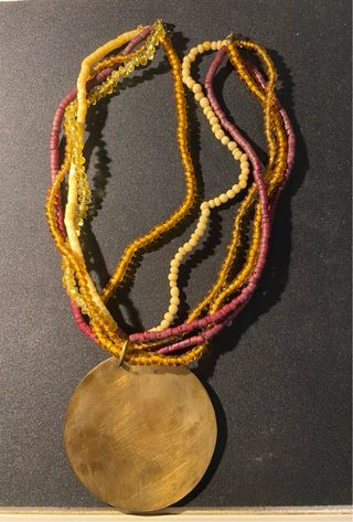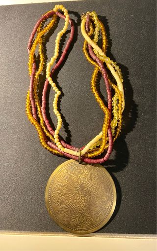 Collar con un diseño de varias vueltas y colgante redondo. - Colgante metálico con grabado ornamental. - Cuentas en tonos ámbar, crema y granate.