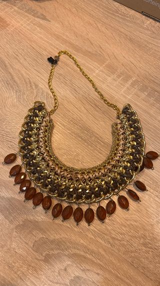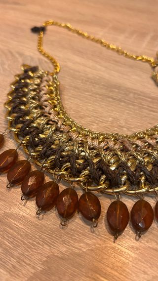 Collar artesanal tipo babero, pieza única de diseñadora venezolana. Diseño elaborado a mano con trenzado en tonos tierra (marrón y beige), base metálica dorada y cuentas efecto ámbar. Es una pieza llamativa y sofisticada, ideal para elevar un look neutro o para eventos especiales. Detalles: • Hecho a mano • Tonos marrón, beige y dorado • Cuentas colgantes efecto ámbar • Cierre ajustable • Pieza statement Está en excelente estado. Es un accesorio especial, diferente a la bisutería comercial.