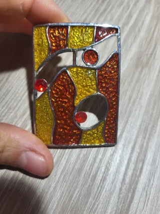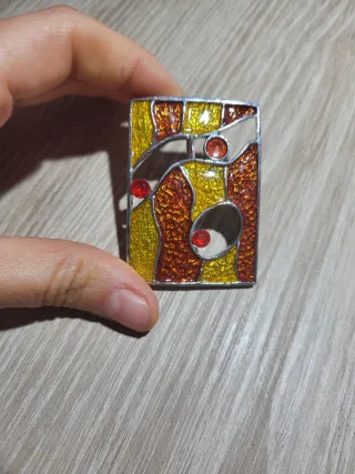 Colgante tipo esmaltado – diseño abstracto naranja plateado amarillo Colgante de estilo artístico y abstracto, realizado en metal plateado con esmaltes en tonos amarillo, ámbar y naranja, y detalles tipo cristales rojos. Diseño geométrico con calados que le dan profundidad y un aire muy original, tipo vitral. ✔ Pieza llamativa y diferente ✔ Buen estado general ✔ Ideal para looks boho, creativos o minimalistas con un toque de color Medidas aproximadas ver fotos