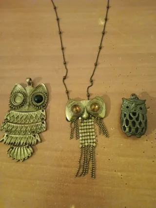 Conjunto de tres colgantes con forma de búho, ideales para coleccionistas o amantes de la bisutería. - Un colgante grande con detalle de plumas y piedra negra. - Un collar con un búho central adornado con piedras ámbar y flecos. - Un pequeño colgante de búho hueco.