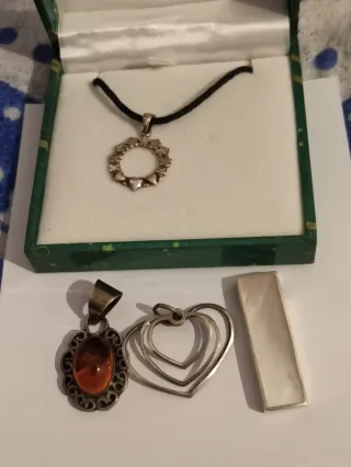 IMPORTANTE: preguntar disponibilidad antes de comprar. Lote indivisible. 5 colgantes plata 925 por 50€. No se aceptan ofertas. Conjunto de cinco colgantes de plata de ley 925.. - Un colgante con forma de globo terráqueo. - Un colgante con piedra ámbar. - Un colgante con diseño de hoja y detalles. - Un colgante ovalado con incrustaciones de nácar. - Un colgante redondo con figura de ángel..