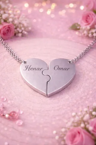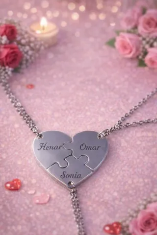 Este colgante de corazón se divide en dos piezas tipo puzzle, cada una con un nombre grabado. Es un detalle especial para compartir. 2 partes 17€ 3 partes 20€ 4 partes 22€ - Diseño de corazón partido. - Grabado con los nombres - Cadena