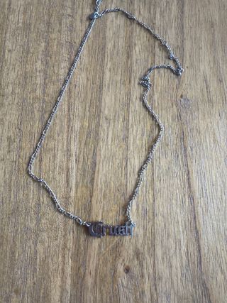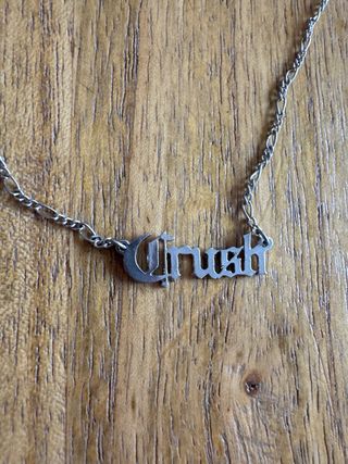 Collar con un diseño de cadena fina y un colgante con la palabra Crush en letras góticas. - Colgante con nombre. - Estilo gótico.