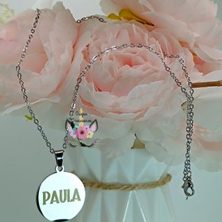Elegante colgante con el nombre Paula de 23 cm de largo y 3,5 cm el nombre - Diseño de nombre caligráfico. - Cadena de eslabones plateada.