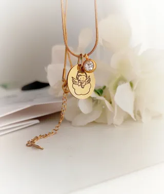 Este colgante personalizado presenta un diseño único puede ser un dibujo como en este caso de ángel sobre una nube, acompañado de una pequeña circonita brillante. Y con la frase grabada que tú quieras! Se le puede grabar Nombres, fecha o cualquier diseño! - Detalle de circonita. - Delicada Cadena realizada en Acero Inoxidable con baño de Oro, ajustable.