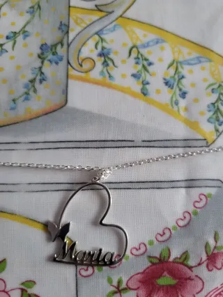 Precioso colgante con forma de corazón y una delicada mariposa. - Diseño calado en forma de corazón. - Nombre 'Maria' integrado en el diseño. - Detalle de mariposa en la parte superior izquierda. - Cadena de plata.