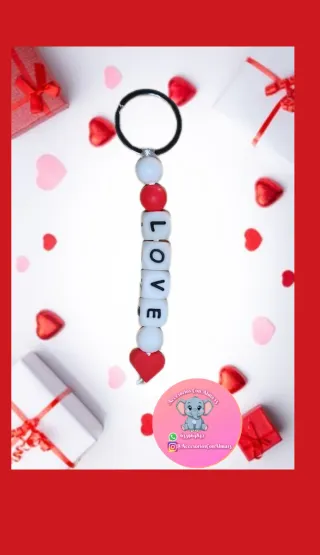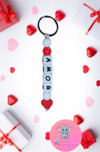 Llavero artesanal de silicona personalizados - Cuentas con letras blancas y fondo negro. - Cuentas redondas rojas y blancas, o color a elegir - Colgante de corazón, u otros más modelos a disposición