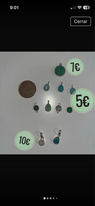 Conjunto de colgantes con piedras naturales. Nombres en fotos del final. Colgantes de piedras naturales facetadas engarzadas en plata de ley para crear tus propios diseños, Turquesa, aventurina, piedra luna, turquesa,crisopasa, amazonita… Precios en la segunda foto. El lote por 50€. Pedido mínimo 10€! Perfectas para crear diseños. - Diseños variados. - Tonos verdes y turquesas.