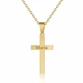 Un colgante cruz de acero inoxidable dorado personalizado con grabado láser en ambas caras. Material hipoalergénico resistente al agua, sudor y uso diario que mantiene su brillo dorado permanente. Perfecto para comuniones, confirmaciones, bautizos, bodas y regalos religiosos significativos. Incluye cadena de 45 cm en acero dorado a juego. Personalizable con nombre + fecha, dos nombres o mensajes especiales. Fabricado en España con calidad joyería real, no bisutería. El símbolo de fe que acompañará para siempre.