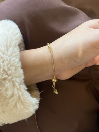 Elegante pulsera con detalles religiosos. - Diseño con cuentas doradas. - Colgante de cruz con circonitas. - Medalla de la Virgen.