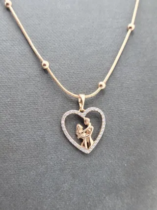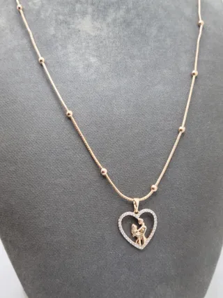 Elegante colgante con forma de corazón y figura de pareja en su interior, adornado con pequeñas circonitas. La cadena es fina y cuenta con bolitas espaciadas. - Bañado en oro. - Diseño de corazón con pareja. - Cadena con detalles de bolitas.