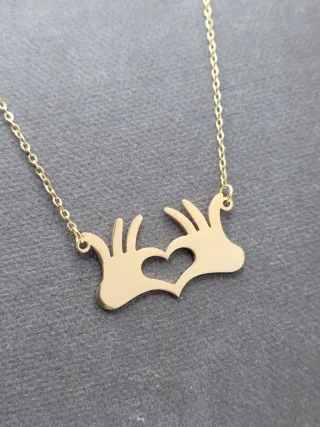 Elegante colgante con cadena fina y un diseño de dos manos formando un corazón. Fabricado en acero quirúrgico con un bonito baño de oro. - Diseño de manos formando un corazón. - Acero quirúrgico. - Baño de oro.