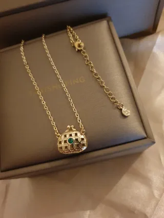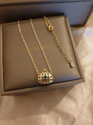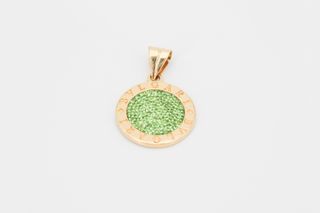 Elegante collar chapado en oro con un colgante con diseño de moneda y una gema verde. - Cierre ajustable. - Incluye caja de presentación.