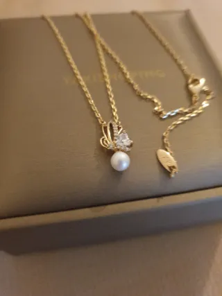 Elegante collar y colgante chapado en oro con un diseño de mariposa y una perla. - Acabado en oro. - Incluye caja.