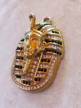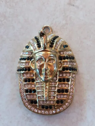 Colgante con diseño de Tutankamón, chapado en oro y adornado con circonitas. - Diseño inspirado en el faraón egipcio. - Detalles en circonitas blancas y negras. - Acabado en tono dorado.