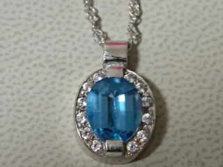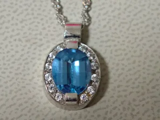 Elegante colgante con cadena, elaborado en oro blanco de 18 quilates. Medidas 45cm - Diseño ovalado con una piedra central azul. - Acompañado de pequeñas piedras transparentes alrededor.