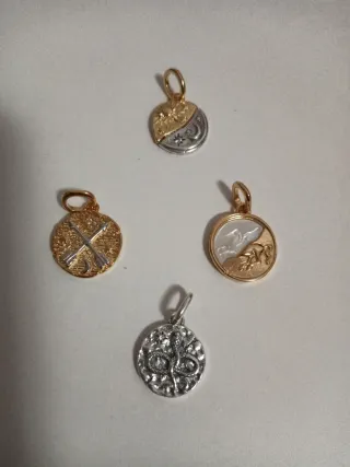 Conjunto de cuatro colgantes con diseños variados. El precio es por unidad. Los colgantes son todos de plata 925. - Un colgante con diseño de sol y luna. - Un colgante con flechas cruzadas. - Un colgante con figura de animal. - Un colgante con serpiente.