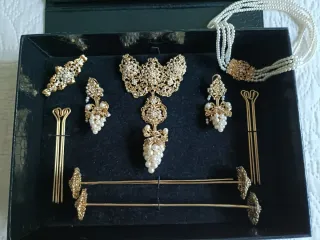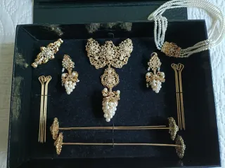 Conjunto de aderezo con diseño de racimo de perlas y detalles dorados. - Broche central con colgante. - Pendientes a juego. - Horquillas para el cabello. - Gargantilla de perlas.