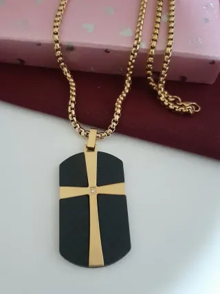 Elegante collar unisex con un baño de oro y un colgante con diseño de cruz. La cadena mide 60 cm de largo. Nuevo -💎 Acero inoxidable baño oro, resistente al agua, no se pone negro -💎 Colgante con detalles en oro y negro, mide 5cm -💎 Pequeña circonita en el centro de la cruz.