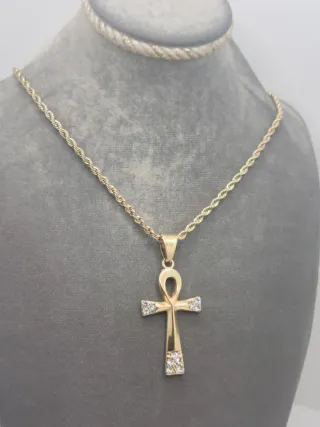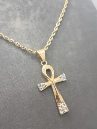 Precioso y llamativo collar con colgante Ankh (cruz egipcia), símbolo de la vida eterna y la protección. Características principales: Material de alta calidad: Fabricado en acero quirúrgico (inoxidable 316L), conocido por ser duradero, resistente a la corrosión y hipoalergénico. Acabado: Cuenta con un elegante chapado en oro de alta calidad. Diseño: El colgante presenta detalles cuidados y circonitas incrustadas (diamantes falsos) que le añaden un toque brillante y sofisticado. Versátil: Ideal para añadir un toque de estilo egipcio o un aire urbano/hip-hop a cualquier atuendo, tanto para hombre como para mujer. ¡Gran oportunidad!
