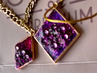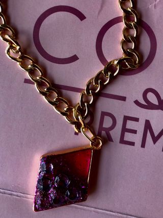 Conjunto de pulsera y colgante con detalles en tonos morados y dorados. - Diseño con colgantes en forma de rombo. - Cadena dorada. - Colgante principal con incrustaciones brillantes.