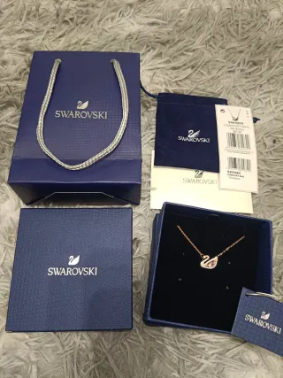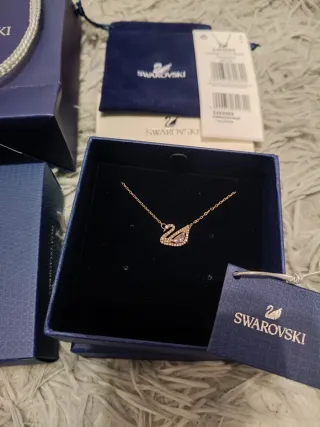 Collar en oro rosa Swarovski con un diseño de estrella. - Cadena fina en tono dorado y plateado. - Colgante principal con forma de estrella y detalles de cristales. - Pequeño detalle de lágrima de cristal. - Pequeños cristales incrustados en la cadena.