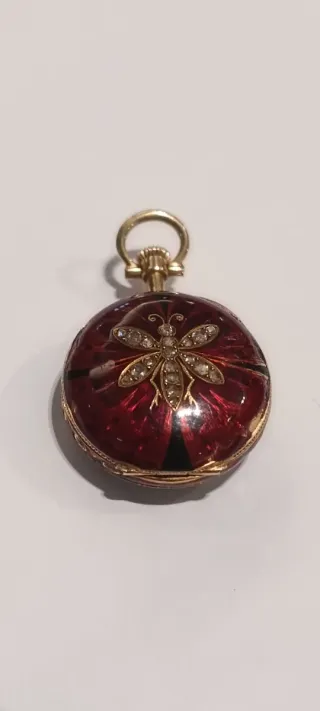 Reloj colgante oro 18kt Caja con esmalte en la parte trasera con motivo de abeja con brillantes Tamaño 24mm sin contar corona Incripción en tapa interior A La Verbena D'or Funcionando. Peso total 16.70gm Precio no negociable