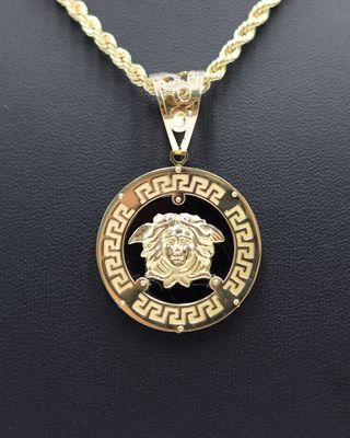 COLGANTE REDONDO MEDUSA ONIX Y GRECA. Oro 18k. Peso: 6,92gr, Medidas: 30mmX3mm. Joyería nueva, tenemos tienda física en Madrid, Ciudad Real, Alicante, Elche, Murcia y Granada. Ref.(2170). NOTA: Puedes ver mas joyería en nuestro perfil. No hacemos envíos.