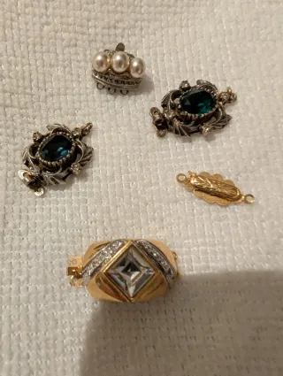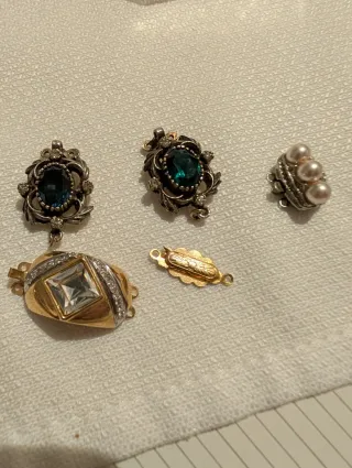 Conjunto de broches con detalles en plata y baño de oro, adornados con piedras preciosas y perlas. Dignos de joyeria. - Broche con piedra azul y detalles plateados. - Broche con piedra verde y detalles plateados. - Broche con tres perlas y detalles plateados. - Cierre de collar dorado con diseño. - Colgante dorado con piedra cuadrada y detalles plateado,son Broches antiguos pero están sin usar. (Si compras todos hago descuento)....