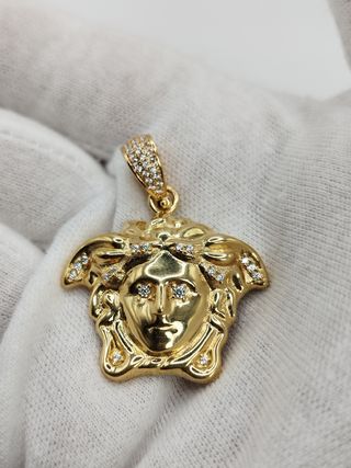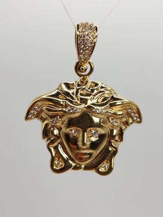Colgante ORO 18 KT. Motivo Medusa Versace y circonita. Largo 4 cm. Peso 10,35 gr. No baño. Precio no negociable.